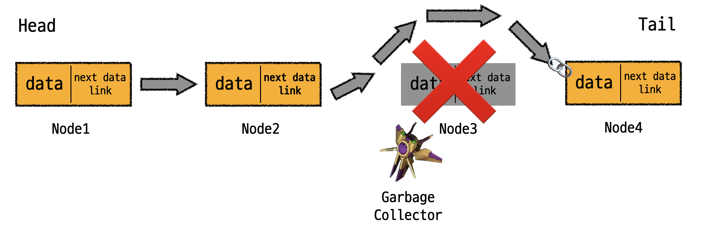 이 그림을 통해서 어떻게 삭제되는지 살펴보자. 만약에 Node3을 삭제를 하고 싶은 경우에, 먼저 Node2를 Node4로 연결을 시켜 주게되면, Node3는 그럼 광활한 데이터 세상을 떠도는 것이 아니라, 가비지 컬렉션(garbage collection)을 수행하는 가비지 컬렉터(garbage collector)에 의해서 사라지게 된다.