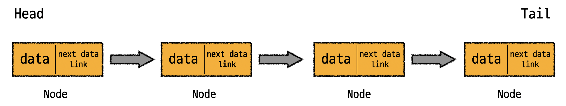 노란색 상자는 각각의 노드를 표현해주고 있고, 분리되어 있는 두개의 방안에는 각각 그 노드가 가지는 데이터와 다음 노드의 위치를 알려주는 링크가 들어있다. 첫번째 노드는 head이고 마지막 노드는 tail이다. 그래서 연결리스트의 경우에는 내가 원하는 데이터를 찾기 위해서는 반드시 head에서 부터 하나씩 다음 노드로 넘어가면서 찾게 된다.