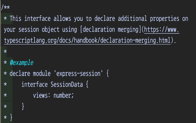 @types/express-session에 가서 찾아보니, 추가적으로 필요한 프로퍼티는 다음과 같이 작성하라는 주석을 발견했다💎! 이게 무슨일이고!!!!! 바로 망설이지 않고 추가해 주었다.