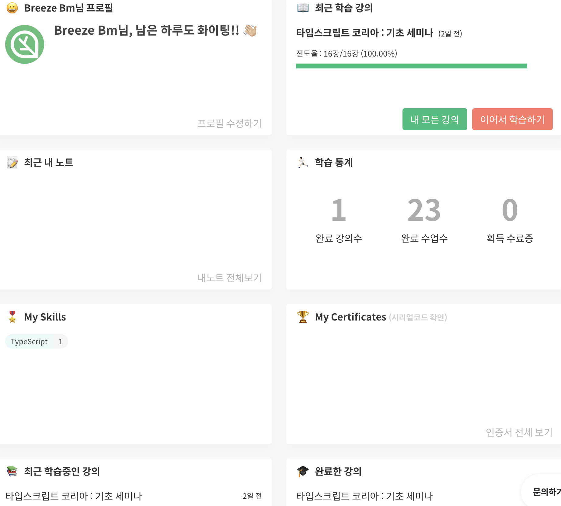 지금도 틈틈히 공부하고 있다. 새로운 것을 배우는게 꺼려지기도 했지만, 의외로 너무 재미있고 즐거웠다. 앞으로도 꾸준히 배웠던 내용도 공부를 해야겠지만 새로운 언어나 스택에 대해서도 자신감 있게 배울 예정이다!
