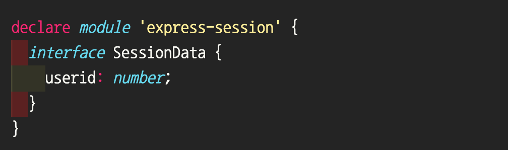 세션을 사용하기 위해서 @types/express-session을 받았다. 이 패키지는 세션의 타입을 지정해 놓은 패키지이다. 생각해보면 userid는 프로젝트에 필요해서 만든 속성이기 때문에 당연히 패키지에는 저 프로퍼티가 없는게 당연하다! 그래서 이걸 어떻게 해결 할 수 있을까 검색을 엄청하고 찾아보기 시작했다.